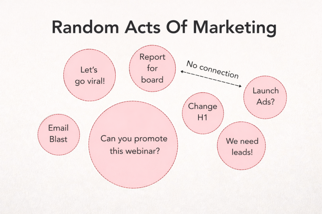 This visual perfectly captures something I see far too often. On one side:“Let’s go viral.”“Launch ads?”“We need leads!”“Change the H1.”“Email blast.”“Promote this webinar.” All valid ideas. But disconnected. This is what I call random acts of marketing — activity without architecture. Every request feels urgent. None of it is anchored to a larger system. On the other […]
